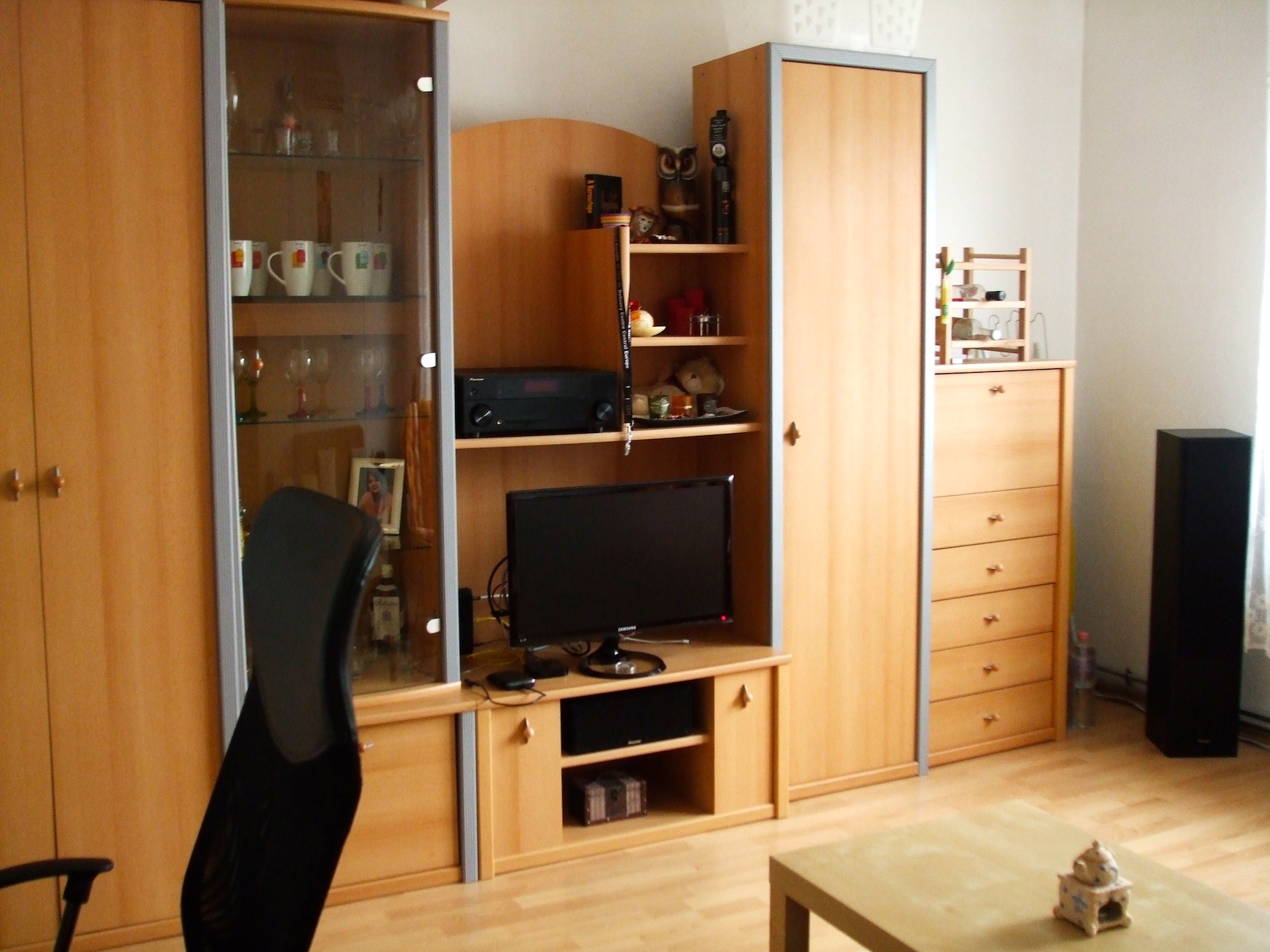 Persze volt alapanyagunk is, ami adott volt, kezdve az Úrfi összegyűjtött dolgaival, majd folytatva az én otthoni szobámból hozott bútorokkal, amiket kalandosat sikerült Nagykanizsáról eljuttatni Fehérvárra. Amikor összeállt a szoba alapkoncepciója, mely főleg a szekrénysor hollétére és a hangfalak 90 fokosítására alapozódott („Befér az erre az oldalra”… „be fog férni”… „hááát necces lesz”… „basszus, ez nem fog beférni”…”és tényleg nem fér be! Újratervezés…”), a következő feladat maga a szekrény feltöltése volt, melyet apránként kiviteleztünk. Nem is hittem volna, hogy a szekrénysor, ami végigkísérte az elmúlt éveimet ilyen jól fog illeszkedni ebbe az albérletbe is, néhány eszköznél (főleg a hangfalrendszer elemeinél) olyan, mintha direkt erre tervezték volna a polcait! :)