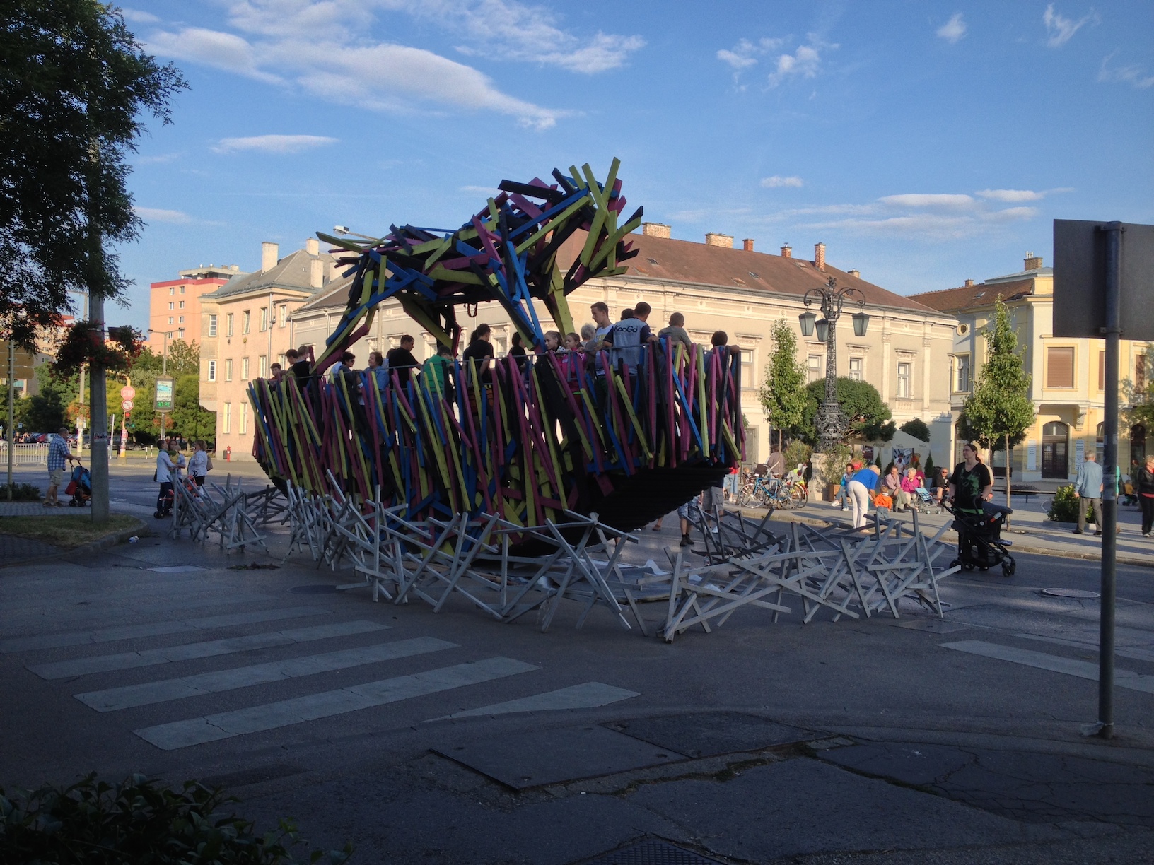 Visszatérve a belvárosba meglestünk egy felállított, fából kreált óriás hintalovat, melyet sok ember együttesen tud mozgásba lendíteni, mi azért nem csatlakoztunk, de kívülről is jó volt nézni.