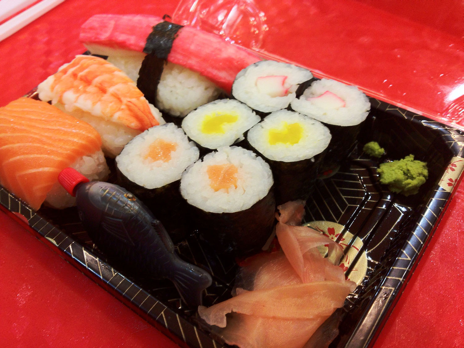 Kinézetre nagyon ízlésesen és precízen voltak elrendezve a különböző falatkák: bambuszba tekerve kör alakú maki sushik, valamint téglalap alakú nigri sushik, amik tetején halak csücsültek (éljen a Google! :D), hozzá pedig minimális wasabi öntet és pár ismeretlen eredetű szeletecske. Végül pár percnyi ismerkedés után neki is estem, próba szerencse címszóval.