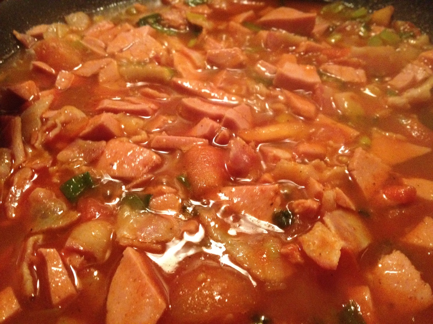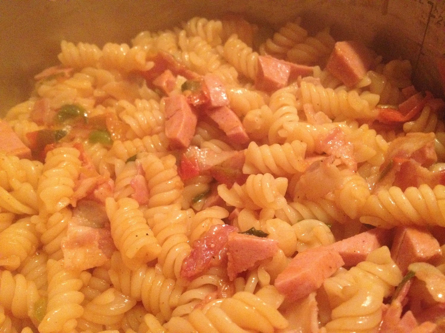 Első lépésként a baconszalonnát és a párizsit elkezdjük minimális olajon sütni serpenyőben, majd sorra adagoljuk hozzá a felkockázott póréhagymát és a paradicsomot, ha pedig már kellőképpen összesültek az egészet felöntjük 1-2 dl vízzel és beletesszük a pörkölt alap kockát. Megvárjuk amíg sűrű nem lesz és össze nem áll, majd a kifőzött tésztával jól összekeverjük. Jó étvágyat! :)