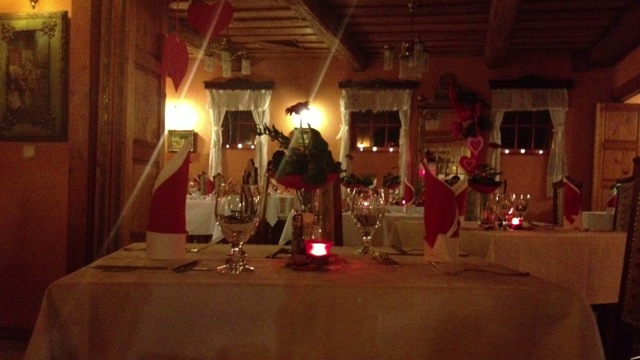 A kiszemelt időpont előtt odaérve még a kulisszatitkok mögé is betekintést nyerhettünk nem csupán a diszletek tökéletesítésével kapcsolatosan, hanem az ételek elkészítésével is. A félhomály, a rengeteg mécses, a piros dominanciája és a virágok nagyon szép harmóniát alkottak, és mivel mi voltunk az elsők, remek helyen kaptunk asztalt, így nem kellett a fő résztől elszeparálva lennünk, mint néhány vendégnek (oda azonban nem jutott Valentin-napi díszlet, ezért fekete pont!), ráadásul a zongora pont ideális távolságban volt tőlünk, hogy hallgathassuk vacsora közben. A PLÁNE mindezek felett pedig az volt, amikor megláttam, hogy a plafonon lévő fagerendák mindegyikébe voltak nevek vésve dátumokkal együtt, akik az elmúlt években itt esküdtek vagy valamilyen rendezvényt tartottak és hogyhogy nem ott volt a MI nevünk is, úgy látszik ez a két név ilyen párosítással egyszer már bevált. :)